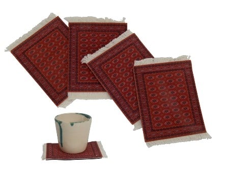 אני בטוח שתחתיות כאלה מדליקות ומיוחדות עוד לא ראיתם! כל תחתית לכוס נראה ממש כמו שטיח פרסי עבודת יד (יש אפילו קצוות חוטים אמיתיים בצבע לבן, ממש כמו בשטיח אמיתי) רק בגודל קטן.