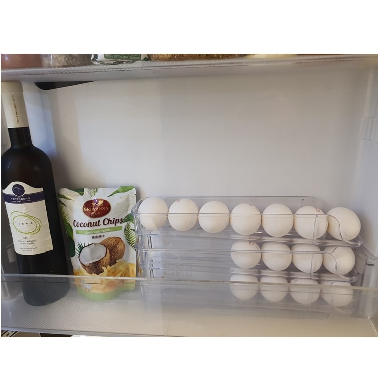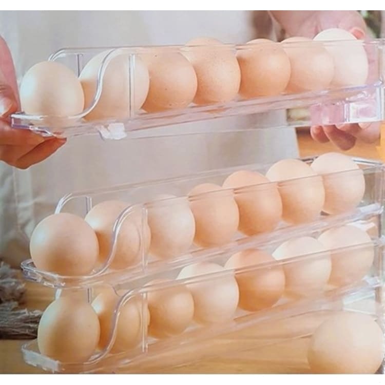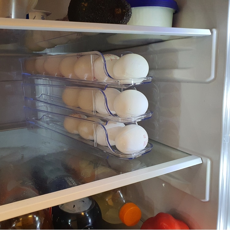 הביצים אינן מתגלגלות מקומה אחת לשניה, מה שימנע את נפילתן ושבירתן. ברגע שהסתיימו הביצים בקומה העליונה, תוכלו לשלוף החוצה מהמקרר את החלק של הקומה העליונה ולהשתמש בביצים בקומה האמצעית וכן הלאה.
