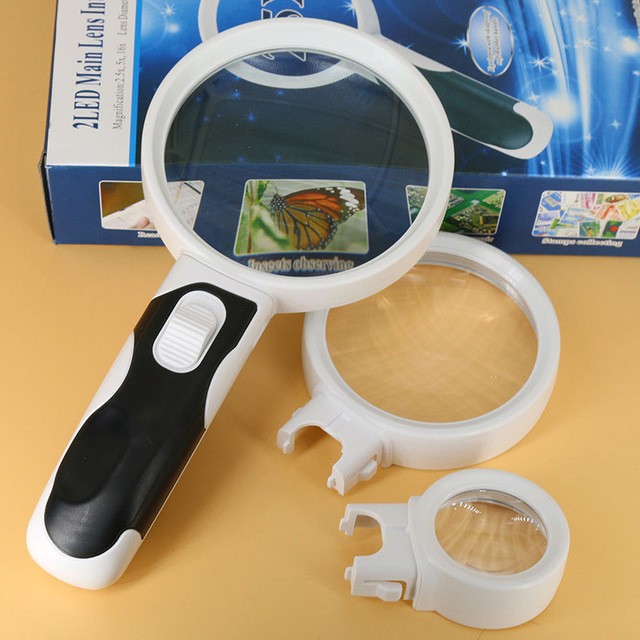הזכוכית מגדלת כוללת 3 ראשים שונים להחלפה ע”פ בחירתכם: הגדלה פי 3.5, 5, 11 ובנוסף ע”מ שתראו ממש ממש טוב ישנה על הידית תאורת לד, המופעלת באמצעות סוללות (לא כלולות).