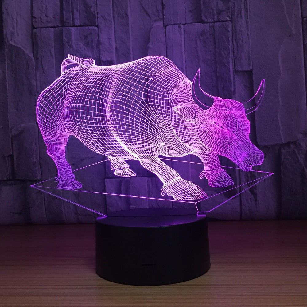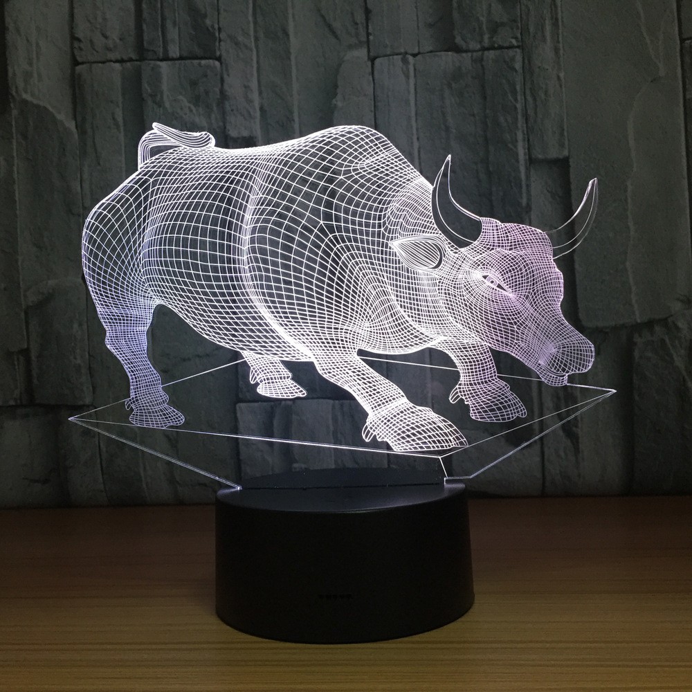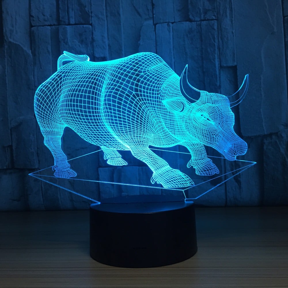 מנורת תלת מימד מרהיבה אשליה של פסלון בעיצוב שור מסתער (סימבולי לשור בשוק ההון האמריקאי: וול סטריט).