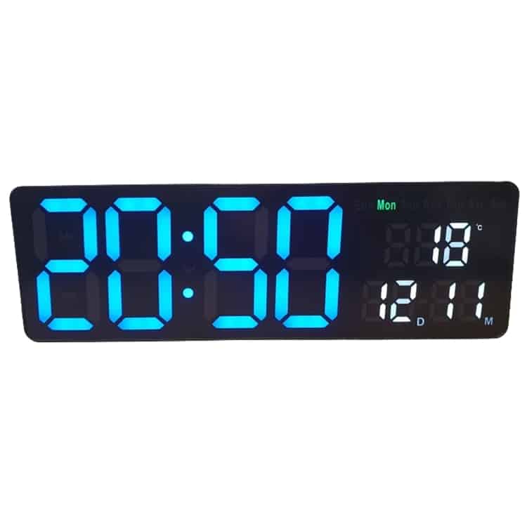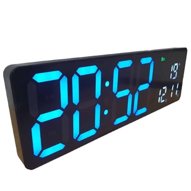 העיצוב המודרני – השעון עוצב עם קווים נקיים, בצבע שחור קלאסי ועיצוב מינימליסטי שיתאים לכל סגנון פנים, בין אם זה במשרד, חדר שינה או סלון. תצוגת השעון בצבע כחול ושאר התצוגה בצבע לבן.